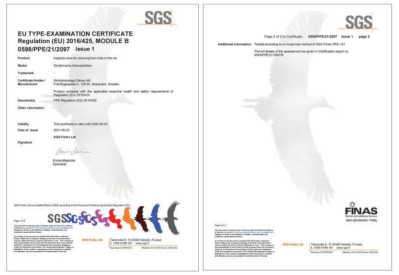 Wearing ice claws is a necessity when setting foot on ice. Hansadubben is the original ice claw and has evolved through the years to this current, optimal design. Ice claws must fit well around the neck, float, last and provide grip against ice and for your hands, even when wet and cold. Hansadubben fills these demands and is CE-certified as personal protective equipment class II.